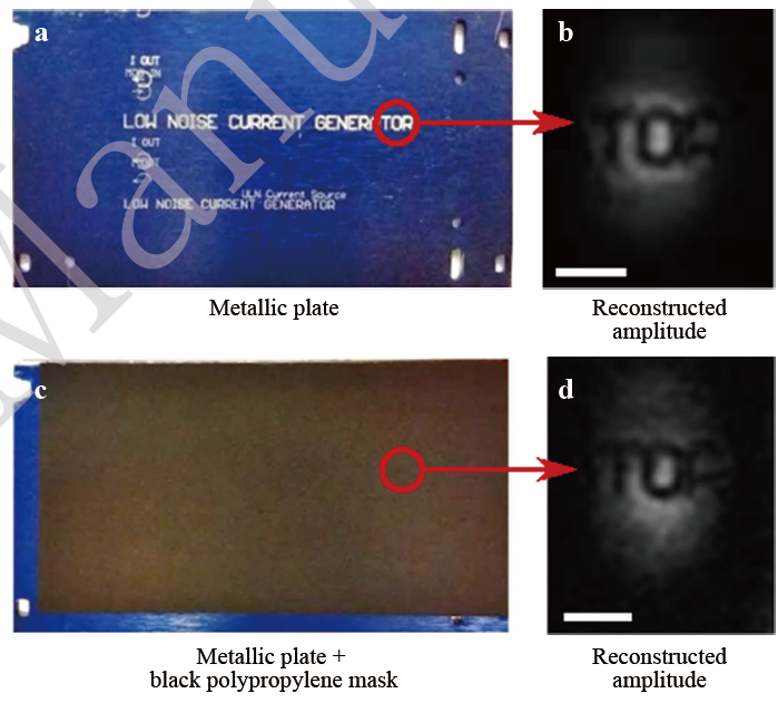 图4:利用反射式离轴太赫兹数字全息技术对隐藏目标进行实时成像。