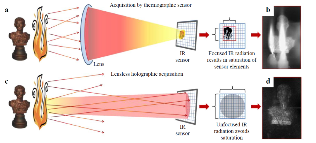 因此,基于上述长波长全息技术的特点,人们展示了诸多有趣且实用的研究。如图3所示,通过红外数字全息技术,能够对隐藏在火焰或烟雾后方的人形雕像的进行图像复现。由于此处该技术不需要透镜对物体波聚焦,可避免记录相机像元接收信号的饱和,从而实现比红外热成像仪更清晰的图像复现。在未来,该技术有望用于火灾情景下的人体成像,具有重要的科学研究意义。