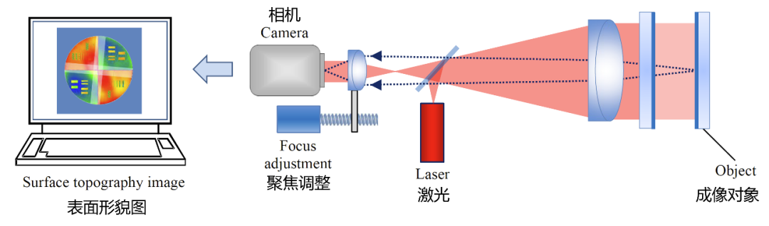 与全息系统不同,传统干涉仪的布置方式是在数据采集之前将物体表面精确地聚焦到相机上。图 6 说明了一种简化的聚焦机制。聚焦通常是手动过程,涉及图像清晰度的主观确定。由于光学表面通常在设计上没有特征,因此常见的过程包括将直尺放置在尽可能靠近调整表面的位置并调整焦距,直到直尺看起来最锋利。繁琐的设置和人为错误的结合使得我们可以合理地断言,今天很少有干涉仪能够充分发挥其潜力,仅仅是因为聚焦错误。数字重新聚焦提供了使用软件解决此问题的机会。