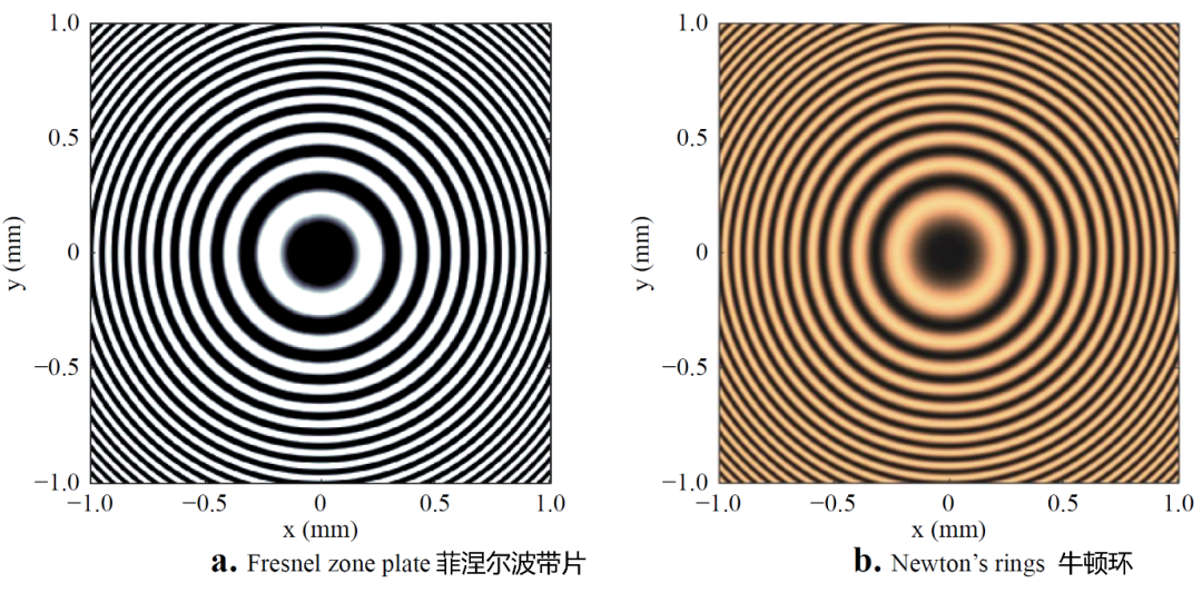 图7 计算的菲涅尔波带片图样和牛顿环(等效于单独的虚拟点光源产生的Gabor全息图)