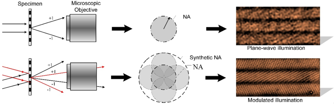 DHM的分辨率由照明光波长、照明和全息记录系统的数值孔径所决定: δ=kλ/(NAillum+NAimag)。DHM的分辨率增强方法可分为三种: